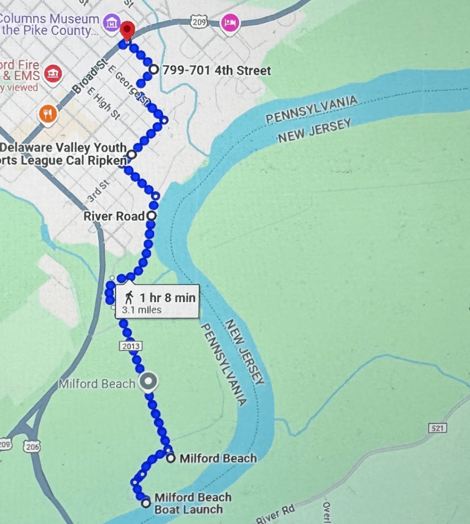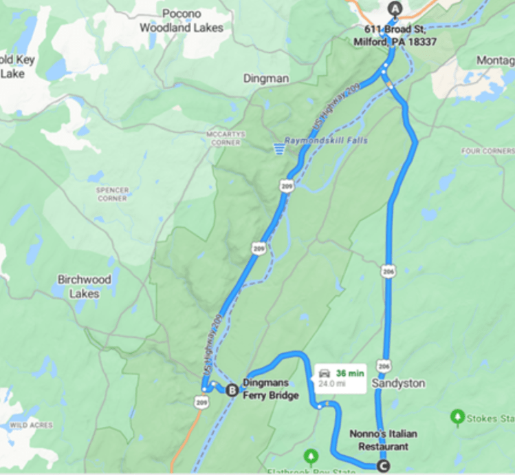 Begin at 611 Broad Street. Head down Broad Street and turn left onto Harford Street. Follow Harford Street to Route 209. Take Route 209 until turning left onto Route 739. Cross over Dingman’s Ferry Bridge. Bathrooms and water are available at the Dingman’s Ferry Bridge.