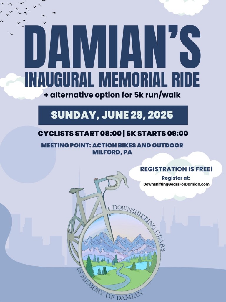 The ride will take place on Sunday, June 29th 2025. Participants will have the choice of a biking or a walk/run route. Regardless of which route you choose, all participants will meet at Action Bikes and Outdoor(611 Broad St, Milford, PA, 18337).